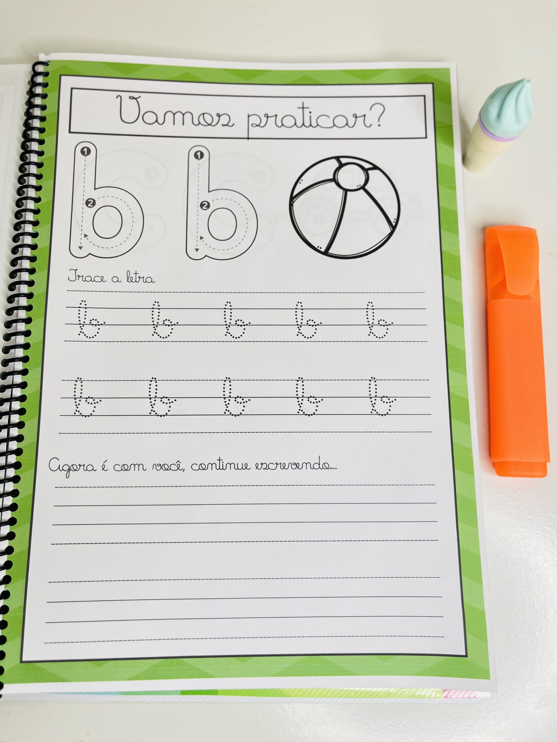 Com linhas pontilhadas, os pequenos podem treinar o traçado das letras, aperfeiçoando a caligrafia e a coordenação motora fina.