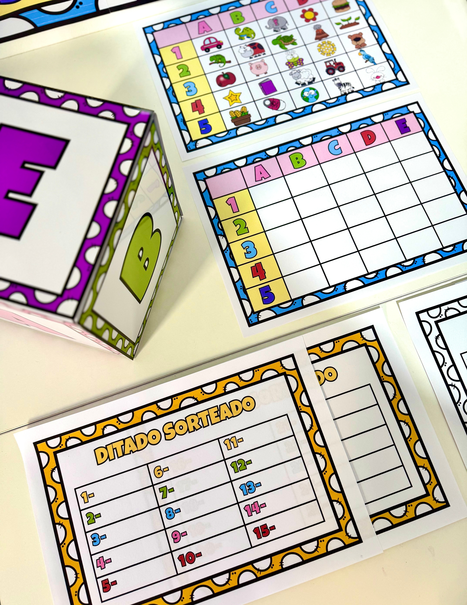 Inclui 25 figuras diferentes 🖼️, folhas de registro 📝 (coloridas e para colorir), tabelas A4 e dados de 16cm 📏;